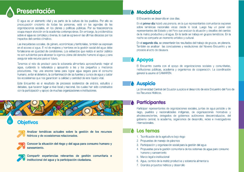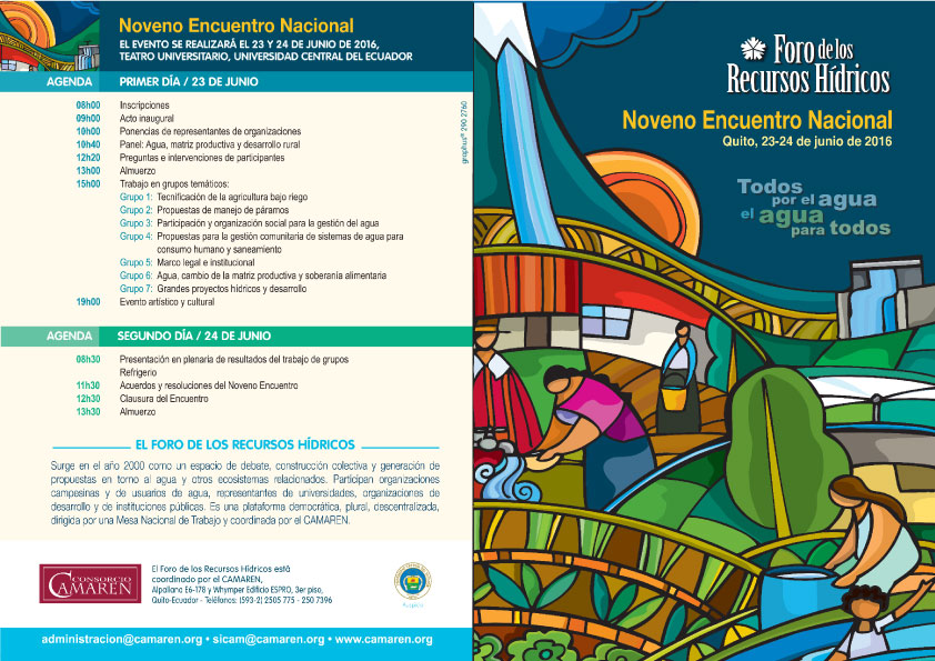 El Noveno Encuentro Nacional del Foro de Recursos Hídricos tuvo lugar en el Teatro Universitario de la Universidad Central del Ecuador, entre el 23 y 24 de junio. En este encuentro participaron organizaciones sociales involucradas en la lucha por los recursos hídricos, entidades del sector público y académico. En el Foro se recogieron los resultados de investigaciones y documentos sistematizados sobre el trabajo realizado por las organizaciones y los aspectos más importantes de la problemática en torno al agua en el Ecuador y América Latina.