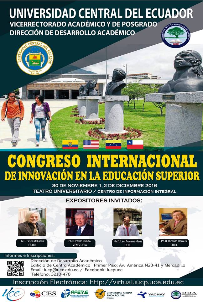 La Universidad Central del Ecuador, al ser un referente de la Educación Superior ha organizado el 1ER CONGRESO INTERNACIONAL DE INNOVACIÓN EN EDUCACIÓN SUPERIOR, evento tendiente a socializar las teorías más importantes, como resultados de procesos de investigación científica, que cualifica asertivamente los procesos de enseñanza aprendizaje en las aulas universitarias, no solo desde la perspectiva de transmisión de información científica, sino desde la visión de la formación integral de profesionales comprometidos con la transformación de la realidad social del país.