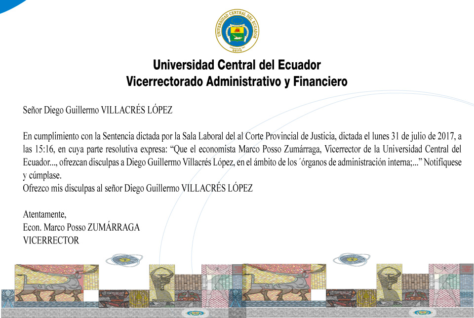 El Honorable Consejo Universitario de la Universidad Central del Ecuador designó como "Profesor Honorario" al Dr. Ricardo Rivero Ortega