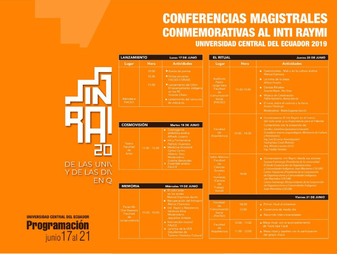 La celebración del Inti Raymi, o Fiesta del Sol, es el reconocimiento a la riqueza de la diversidad, pluralidad y diferencia. Está viva, y como evidencia contó con la participación activa de varias Universidades, En este proceso histórico se ha visibilizado con conferencias, tomas de espacios, presentación de libros, danzas, rituales, música, conversatorios y ceremonias realizadas en la Universidad Central del Ecuador, en las facultades de Comunicación Social, Artes, Jurisprudencia, Ciencias Sociales y Humanas y Arquitectura dentro de estas celebraciones, del 17 al 21 de junio.