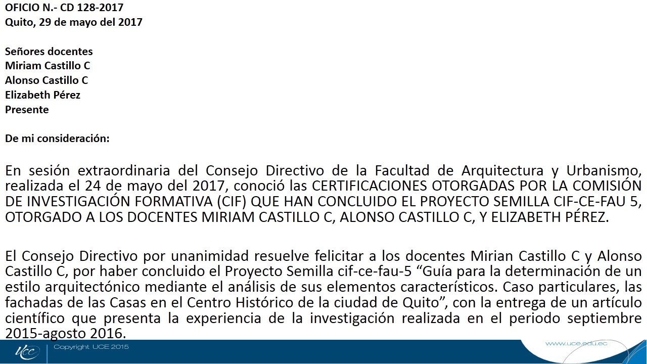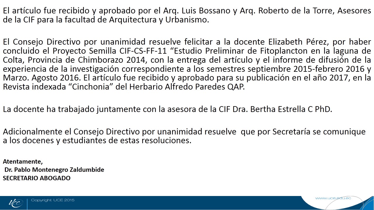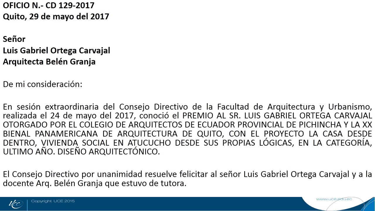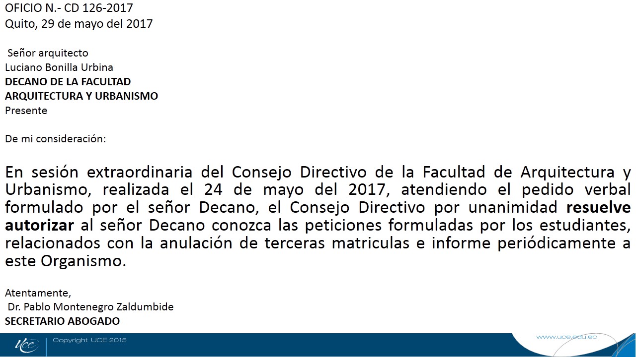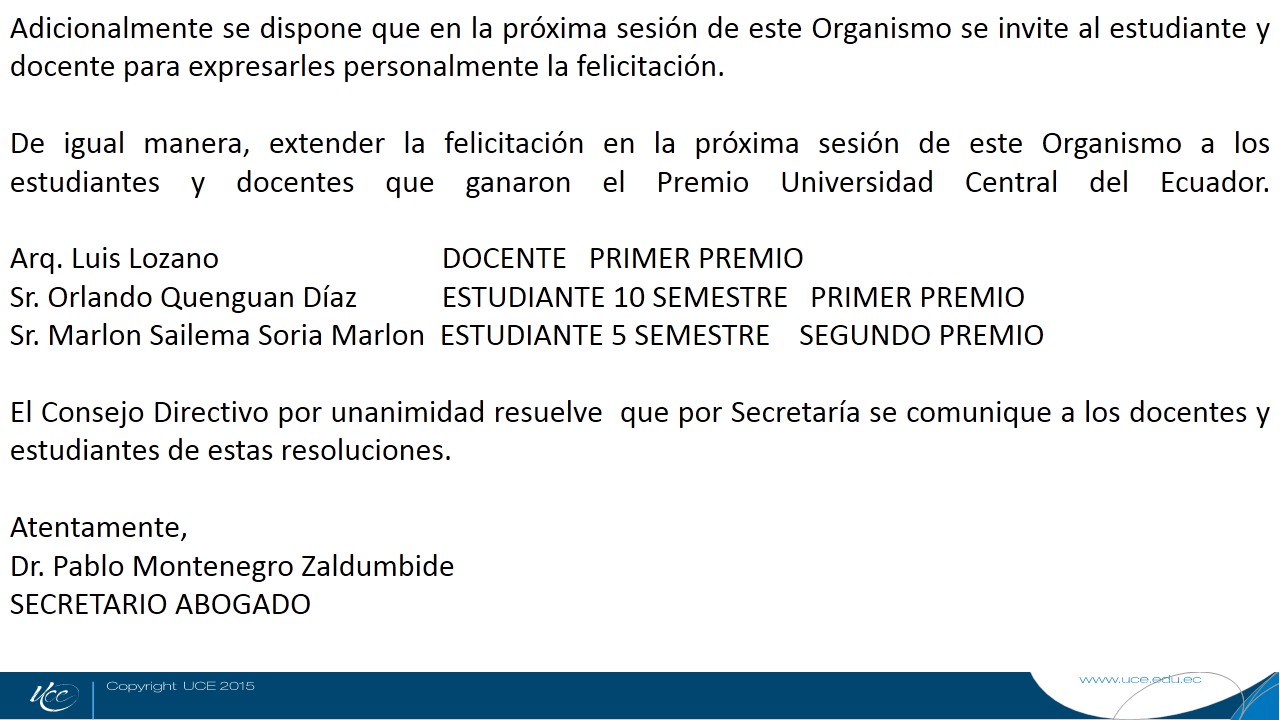 Por disposición del señor Decano, arquitecto Luciano Bonilla Urbina, me permito invitar a la SESION ORDINARIA del Consejo Directivo de la Facultad de Arquitectura y Urbanismo que se efectuará el día miércoles 28 de junio del 2017, a las 14h00, en el Hemiciclo, de la Facultad, con el objeto de realizar en el segundo punto del Orden del Día, el reconocimiento de las siguientes personas: