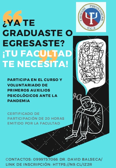 La Facultad invita a los estudiantes de los últimos semestres, egresados y graduados de nuestra institución, a participar en el VOLUNTARIADO Y CURSO DE PRIMEROS DE AUXILIOS PSICOLÓGICOS ANTE LA PANDEMIA
