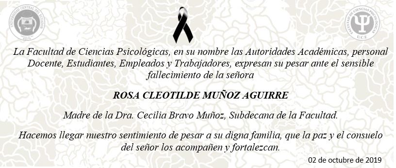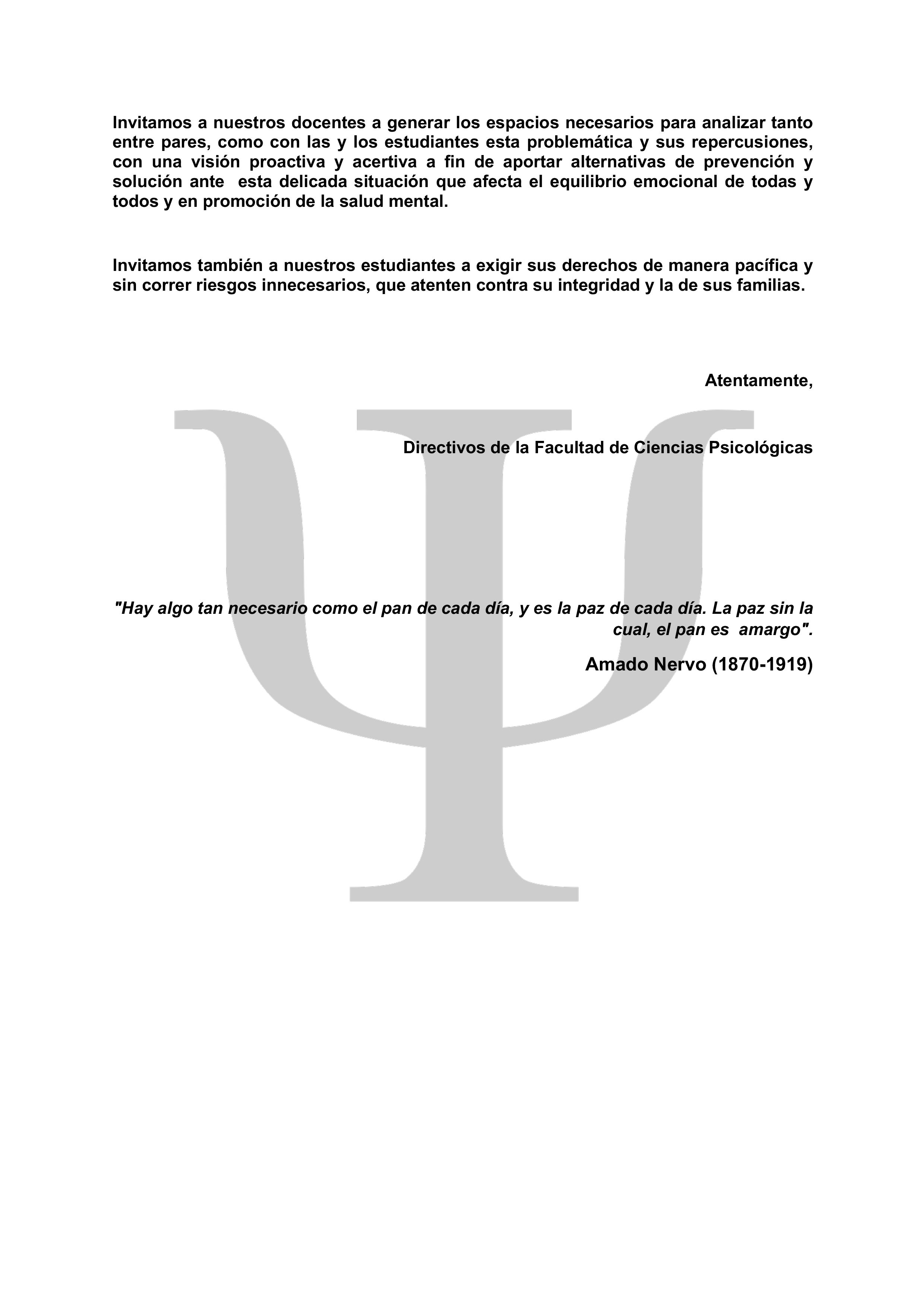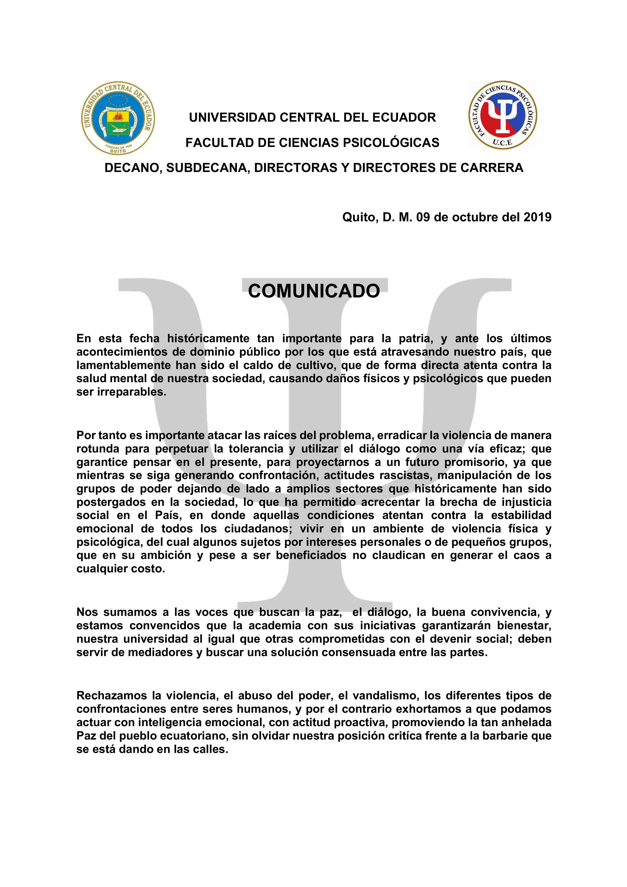 十月 09, 2019 |En el caso de que algún Sr./Srta. Estudiante de la Facultad de Ciencias Psicológicas se encuentre privado de la libertad producto de las manifestaciones, deben comunicarse con sus directores de carrera de la Facultad para que juntamente con la Dra. Jenny Romo, Secretaria Abogada de la Facultad, brinden el apoyo legal necesario y puedan recobrar la libertad lo antes posible.