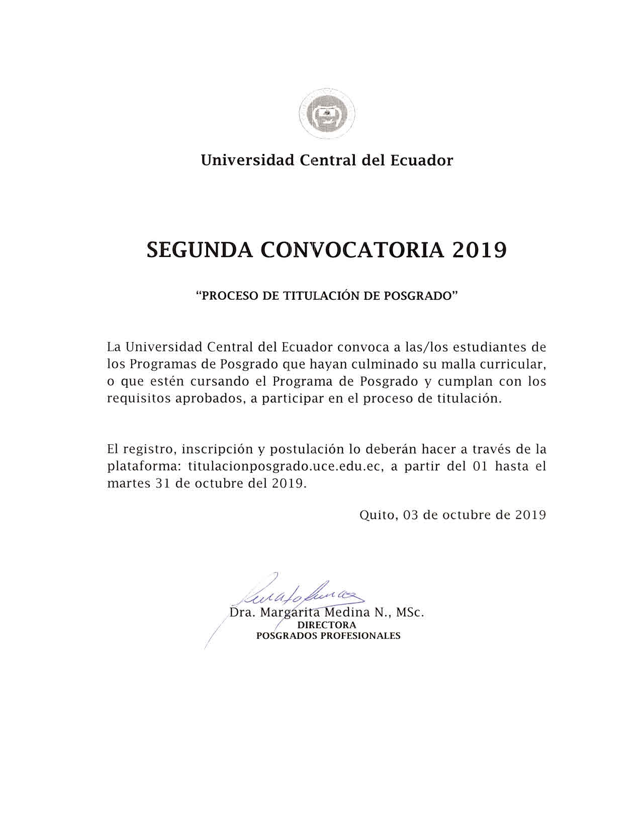 SEGUNDA CONVOCATORIA AL PROCESO DE TITULACIÓN DE POSGRADO 2019